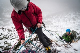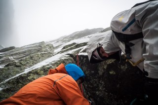 Michael, Ryan and I got to the base amid stiff winds, rain, sleet and snow — again, ideal Scottish conditions. It was a Saturday, but there was no one on Pinnacle Gully. We smiled at each other, joked, and then started to get dressed for a trip to the moon.