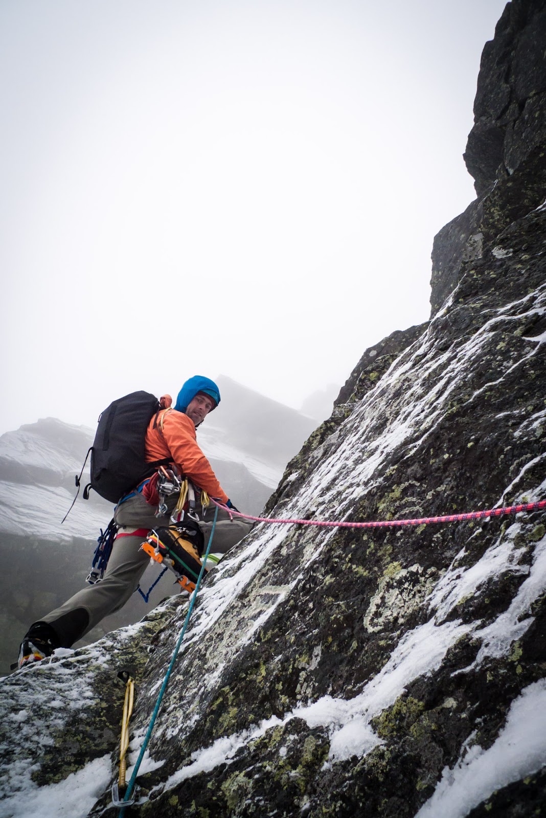 The line basically starts right at the base of Pinnacle Gully, but instead of heading up the gully you march straight up the steepest line Central Buttress offers. Much of it is slabby and poorly protected, and often there is just a veneer of ice and snow. It is a mixed route similar to those rime-ice covered rock routes they are famous for climbing in Scotland — desperate and possibly dangerous but more fun than it is risky.