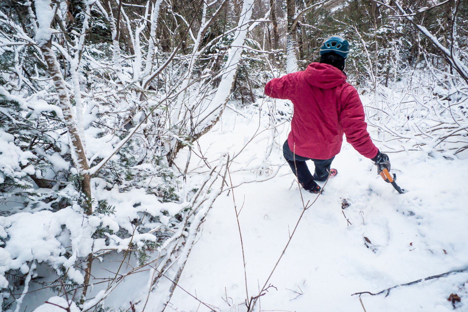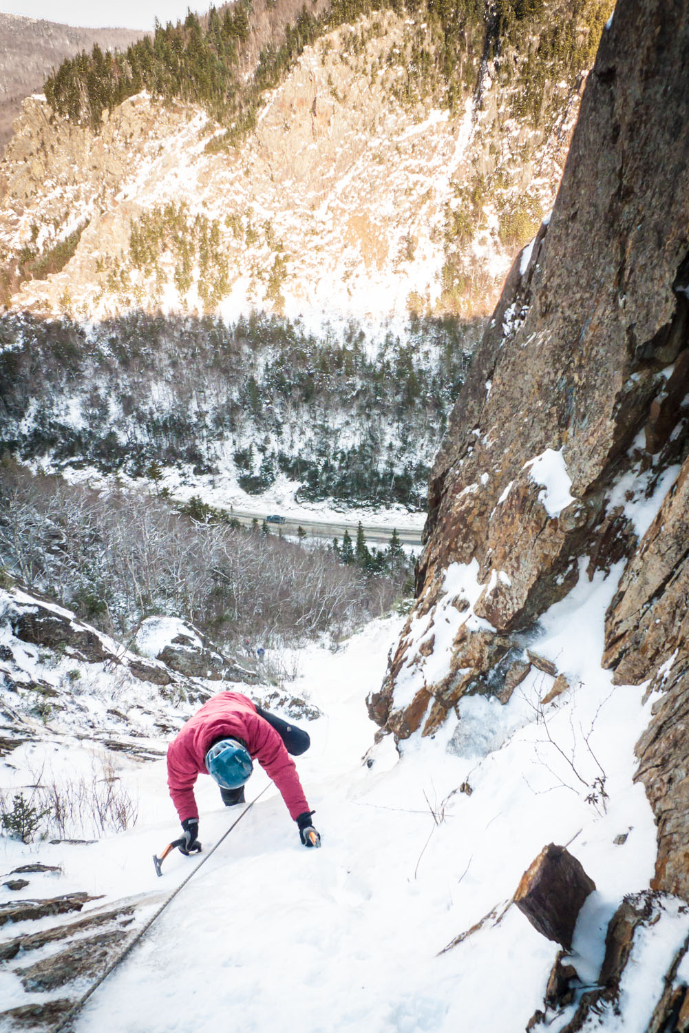 It’s nearly a two hour drive from the Mount Washington Valley to Dixville Notch, but good conversation made the trip go quickly. Soon we were parked in a pullout looking up at Parasol‘s two pitches of moderate ice. There was a party of three on the second section (Quebecois according to their license plate), and another party pulled in behind us (Quebecois as well) as we pulled our boots on. Ordinarily such numbers would be a crowd, but we weren’t bringing much with us. I had a backpack with crampons, a puffy jacket, a small water bottle, my helmet and tools, and Scott wore all his gear and carried his tools and crampons. This mission was about moving fast, we’d decided, not technical challenge. The ropes would stay in the car.