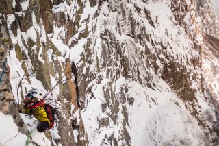 Mean Streak is not like The Mercy or Baghdad. It is vertical, with lots of hooking on flakes held in place by other flakes. After the ice ended the largest piece of gear I got was a red Alien. I placed several tiny HB offsets, the kind I prefer never to test on Cathedral in summer. But that’s all there was, so I slowly picked my way upward, searching for gear, testing placements, working my crampons and releasing myself from the tug of gravity, the weight of fear. I submitted to the process, falling upwards, relying on trust and faith.