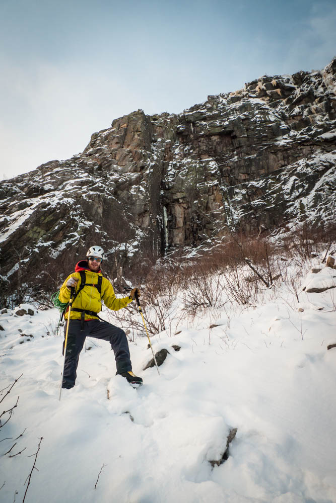 I first saw Mean Streak last December on my way to climb Fafnir. The Streak is an early season ribbon of ice plastered in a corner that dead-ends at a roof. The Mean begins after the climb steps left into a corner of shattered rock into sustained mixed terrain. The route continues to the top of the cliff, but the first pitch is recognized as the prize. Last December it called to me and I got on it once, late enough that the ice had dried and turned fractious. It took me an hour to reach the mixed terrain, and the rock was glazed in ice. Cams were useless so I lowered, determined to come back sometime soon.