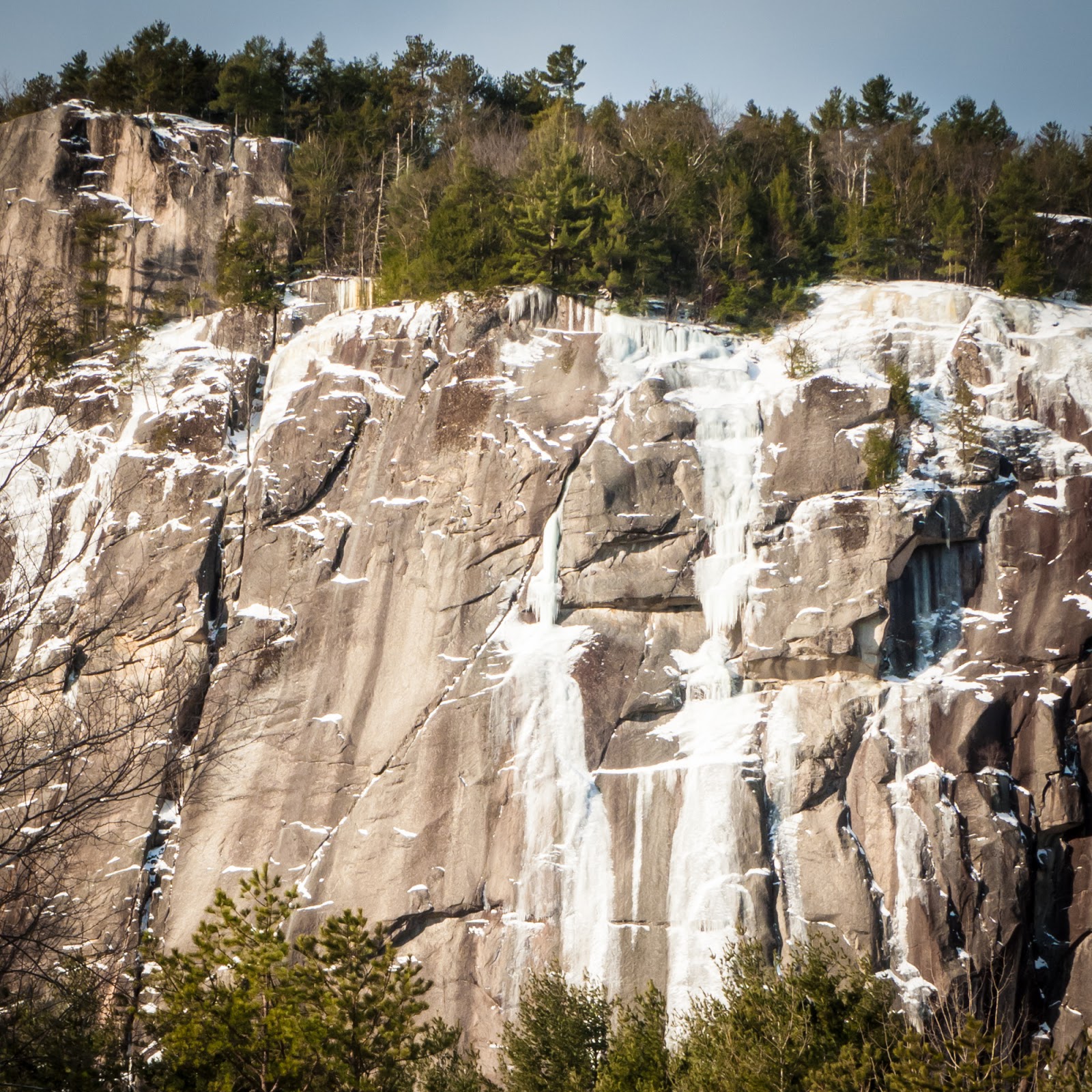 Diagonal earned its name because it follows a right-trending dike through the blank slab. The dike is full of square features, but it’s basically devoid of cracks. In summer the climbing is exposed 5.4, but in winter when it’s snow-covered and the leader is wearing boots and crampons it feels more like M6. It is runout, insecure, exposed and terrifying. And it’s fantastic. I don’t want to venture a guess as to how long it took me to lead, but it was uphill rowing the whole way. Many of the holds are rounded. Getting your crampons to stick takes dedication. Plus the snow made finding the little gear there is extra-difficult.