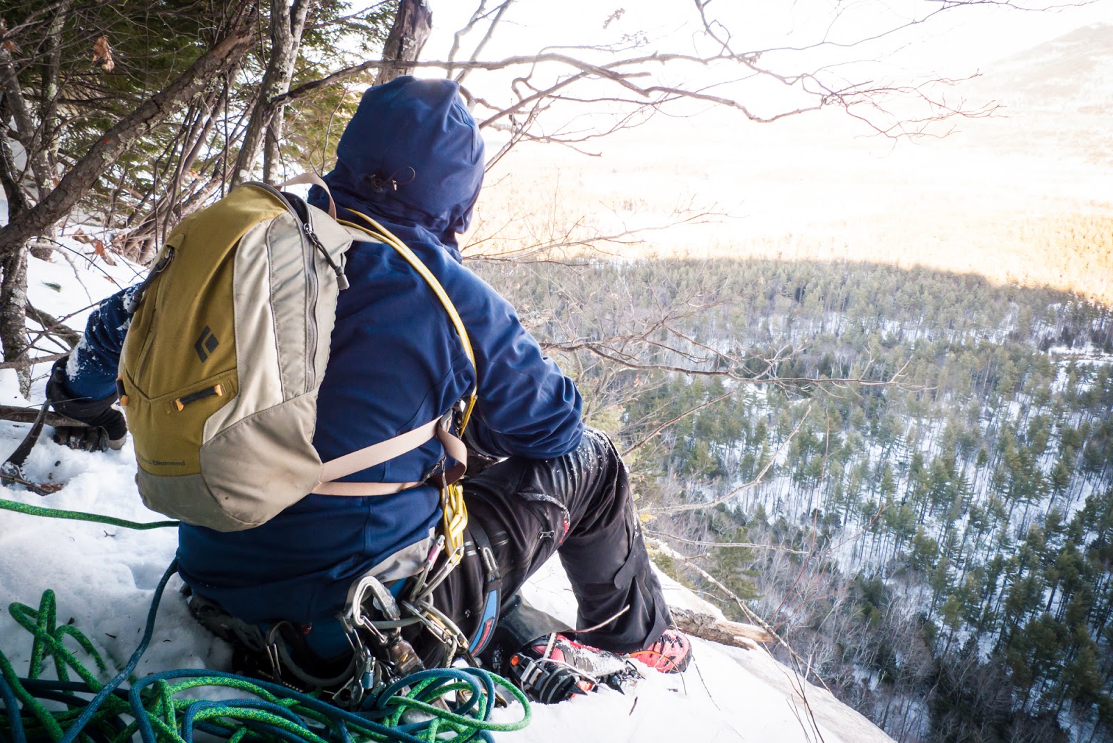 I have not been on much ice thus far this season, particularly vertical ice, so it took a bit to center myself once I sunk my picks. The ice, however, was just as I suspected — forgiving. I moved upwards a swing at a time, placing more screws than necessary but enough to stay comfortable. At the break I grabbed a no-hands rest, sunk another screw or two and launched for the apex. Every swing sunk with minimal effort, and I couldn’t keep the smile off my face. This too was what I was here for.