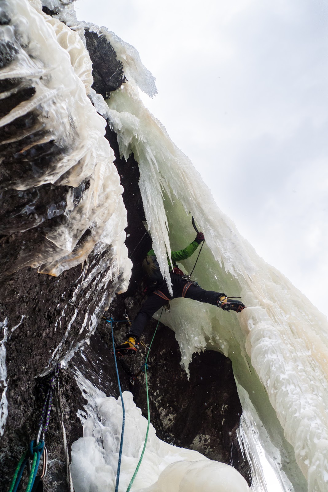 The ice was OK. Peter, as usual, fired it. There were delaminated sections, and above the first steep section he knocked down a good portion of a column, but all in all it was reasonable climbing. It was the sort of thing on a good day I would have sung my way up. But not today. My plans didn’t come together they way I meant for them to. As Peter climbed, the clouds descended. Soon the wind was whipping, and snow was wiping across the face in horizontal sheets. Peter built a belay below and to the side of one of the daggers as it poured roughly a gallon of water per hour. When I got to there I pulled on my Das parka and told him get to the top. He obliged, working his way up awkward formations with finesse. By the time I started climbing again all four layers below my Das were soaked. The wind howled as I worked my way up the cave and out onto the column. With every gust I watched the dagger above me sway and moan. I yanked gear out as fast as I could, trying to traverse out from below it, sure I would die if it let loose. I still had my Das on, but water was oozing down my left side. My hands were frozen into claws. Carabiner gates refused to open. It was not ideal conditions. I wanted to be done, to be down, to go home.