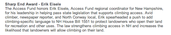 The official announcement was yesterday, but last week I got an email from Zach at the AF telling me I was one of the winners. I volunteer as a regional coordinator for the Access Fund in New Hampshire (and sometimes assisting with issues in Maine), and this past year I was part of an effort to get the state of New Hampshire to include climbing among the activities landowners could open their property to without fear of liability. After a lot of emails, phone calls and conversations with lawmakers the effort to recognize bouldering, rock and ice climbing as protected activities succeeded, making it into law over the summer. I was thrilled then to learn our effort (with the help of a few sympathetic legislators) succeeded, and I was thrilled last week to hear I would be getting the Sharp End award for that victory.