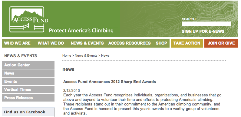 The Access Fund announced their 2012 Sharp End awards yesterday, recognizing the people, businesses and organizations that go above and beyond to protect climbing access.