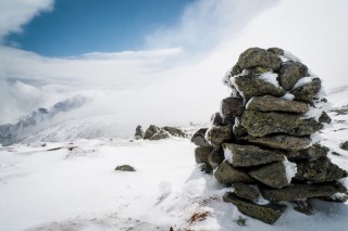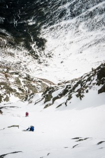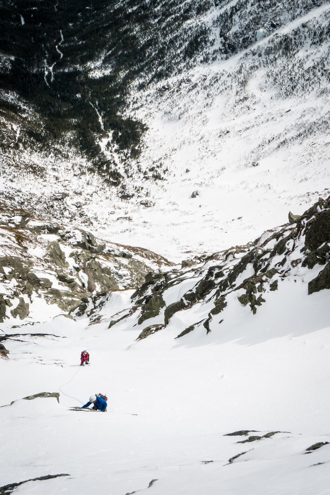 I can’t imagine I’ll be getting out for anymore days on ice after today, but considering how good todays was I don’t really care. At about 9:30 a.m. this morning I decided to go see if Cloudwalker was in up in Huntington Ravine. I figured it was worth a solo attempt since it doesn’t really take screws anyway. I didn’t get up to Pinkham Notch until 11 a.m. or so, so I trucked up the trail as fast as I could. I got to the base of Cloudwalker around noon, nowhere near in time to climb it. There were remnants up high, but it looked like rain decimated it several days ago. So I shifted to Plan B — solo Pinnacle and Damnation. I was right at Pinnacle, so I hopped on that first, then I trucked over to Diagonal, downclimbed that, and went up Damnation. I had planned to head out via Lion’s Head, but the wind was bad enough I opted to climb down Central rather than cross the Alpine Garden. I hustled down the trail and got back to my car at Pinkham just before 4 p.m. It was a beautiful day, nice enough for my face to get sunburned. I saw only a handful of people in the ravine — one party on Pinnacle, one on Damnation, and then two skiers heading up Central. I know lots of people are thinking rock climbing (as am I), but when days like this arrive they aren’t for passing up.