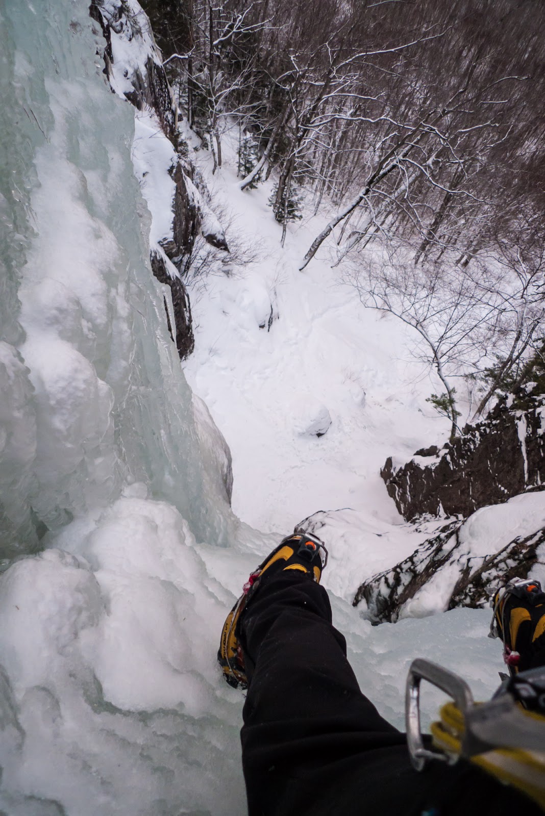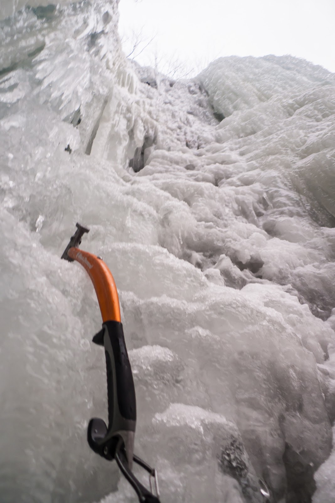 The first steep section went quick, a handful of moves up to a ramp. From there I kept going, swinging and kicking into dryer conditions. The ice was an open book as it flowed down a corner, so I stemmed my way skyward.