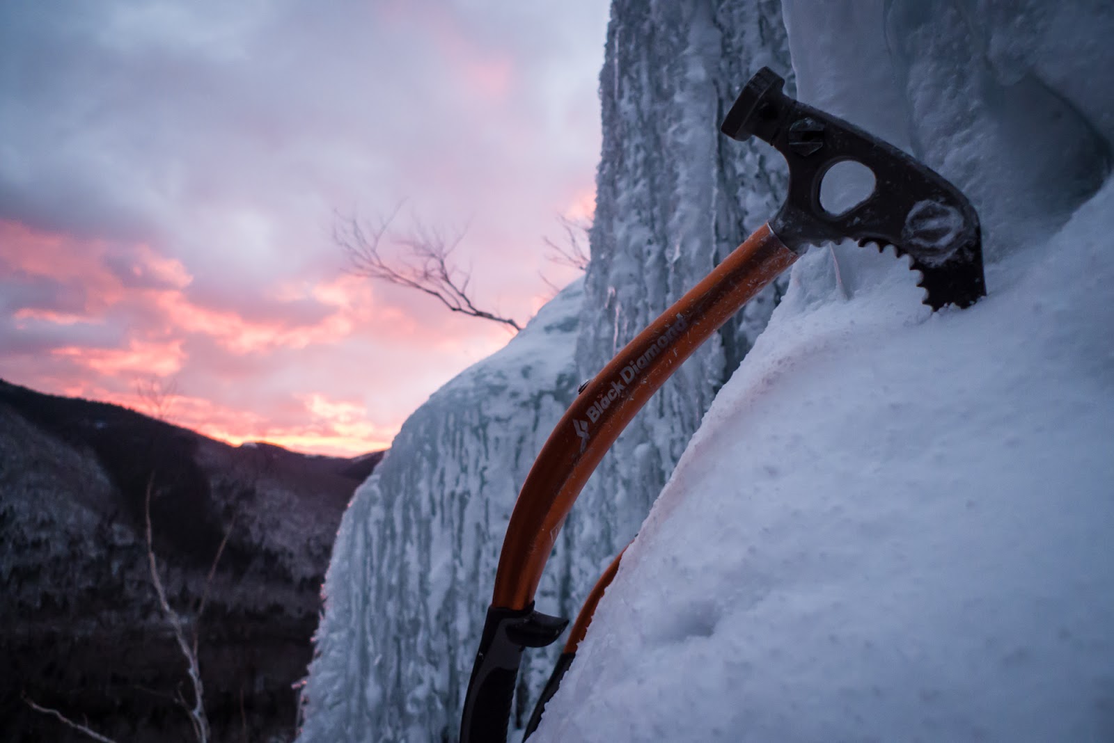 But I knew — KNEW — I could climb it. I’ve climbed Dracula countless times and never fallen. That doesn’t mean I never will, but I knew at that moment the thing holding me back wasn’t my strength or my skill, it was my head. The thing holding me back was me. I worked my way down, out of the corner and back to the ramp. I found a stance and buried my tools in the ice. I pulled off my gloves and tightened the laces on my right boot, took a deep breath, then another. “OK,” I thought, “you know the consequences. There is no logic to going upwards. None.” I switched feet and tightened the laces on the left boot. “Keep going and you could die.” I thought. “Just go down. The ground is safe.” I looked at my tools, drops of water glazing the orange paint, and then raised my eyes up. There were miles of steep ice above me. I looked at the sky, then down at the ground, and I felt a wall inside me crumble.